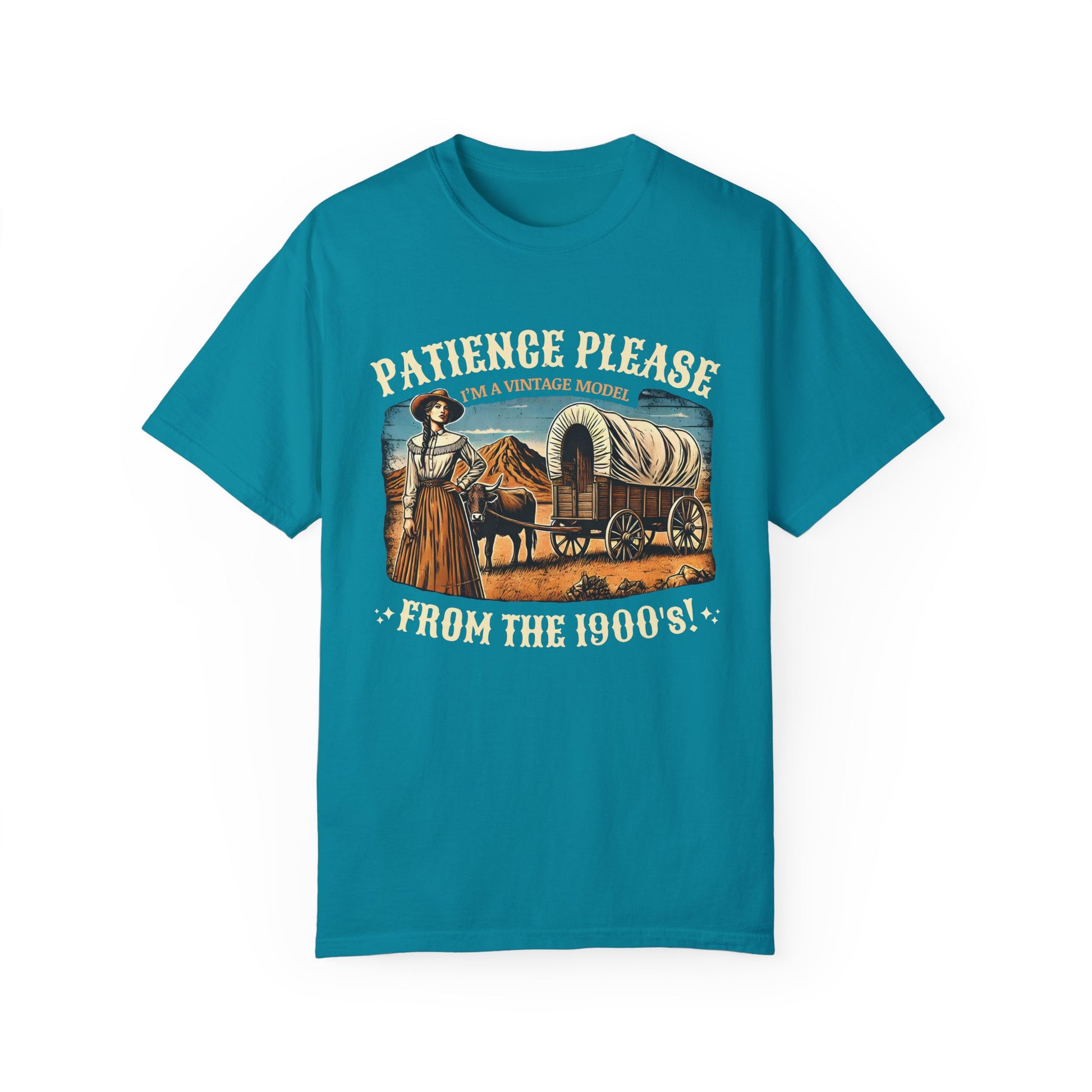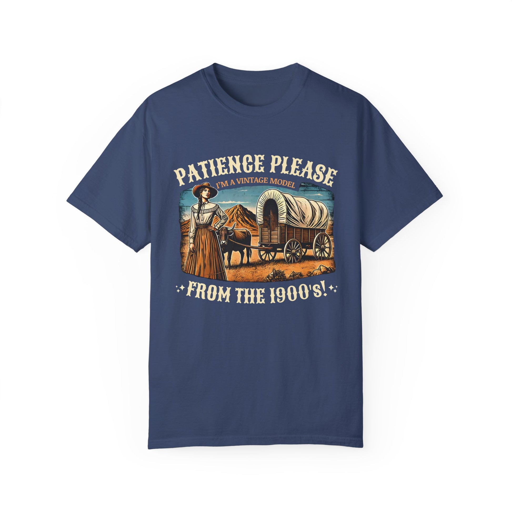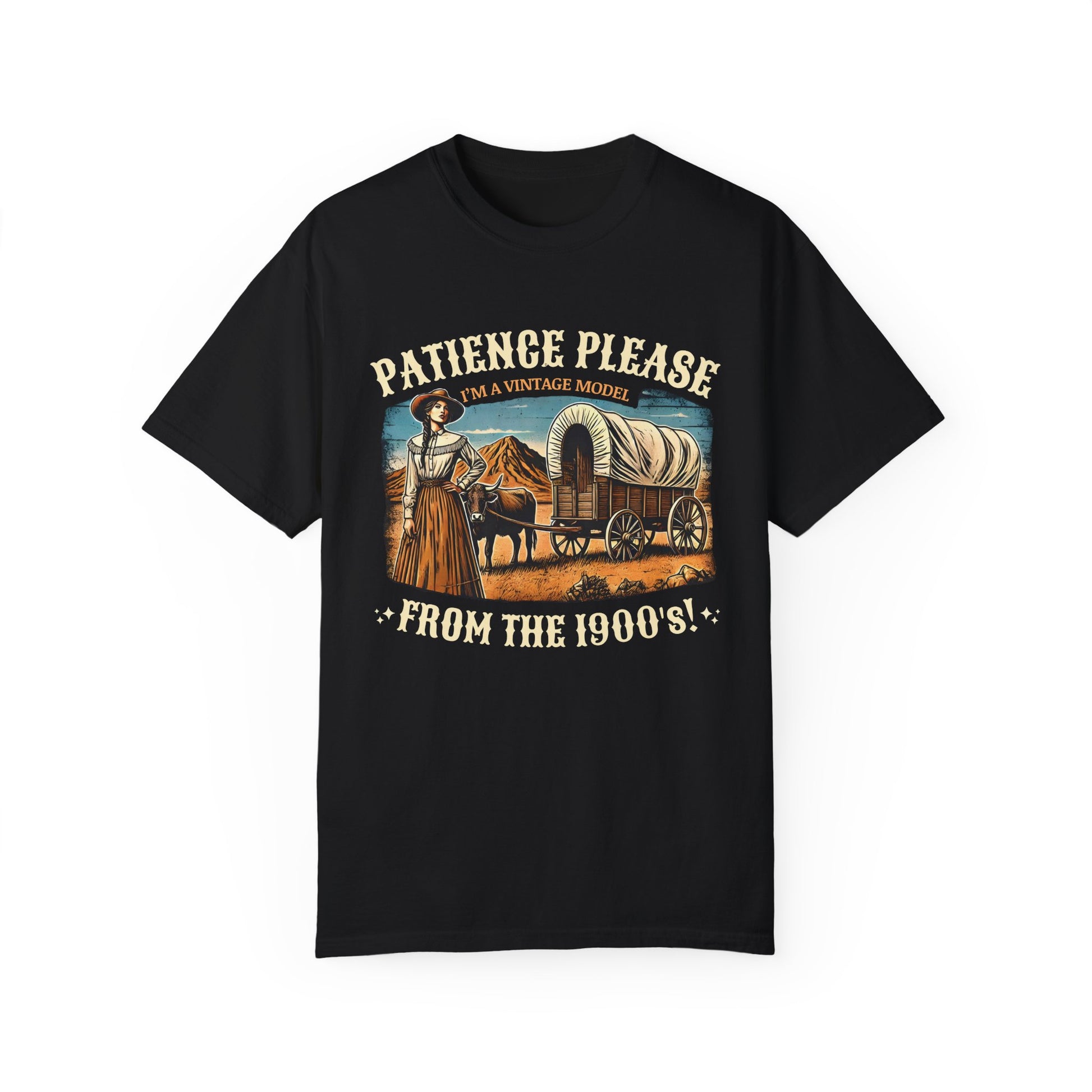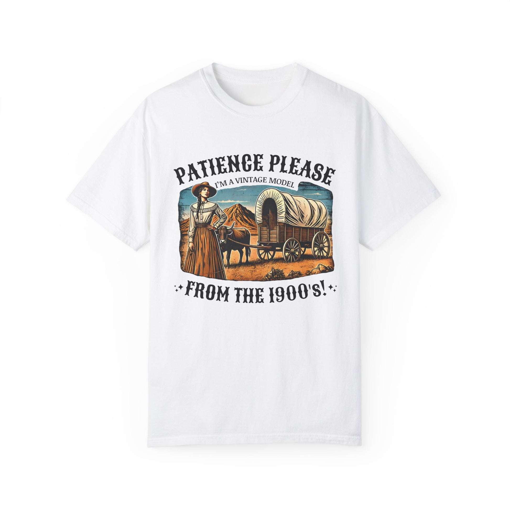Channel timeless style with a touch of humor! The Comfort Colors 1717 Shirt featuring the phrase 'Patience Please, I'm A Vintage Model From the 1900s' adds a nostalgic twist to your wardrobe. Perfect for those who embrace their vintage charm with pride, this ultra-soft, garment-dyed tee offers a relaxed fit and retro appeal.